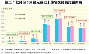 利嘉閣地產研究部主管陳海潮表示,整體樓價攀升,中小型住宅價格亦水漲船高,不少更由中細價跨越分水嶺晉身中高價行例,帶動中高價交投佔比首度觸及四成的有史新高。綜合土地註冊處最新資料,2018年七月份全港共錄2,705宗價值700萬元以下的二手住宅買賣登記,佔同期整體二手住宅買賣登記(4,509宗)比例約60.0%,較六月份約61.4%再跌1.4個百分點,為連續4個月回落兼迭創歷史新低,反映隨著樓價不斷上升,中細價物業買賣登記佔比持續萎縮;不過,踏入下半年,在較多利淡因素左右下,樓價升勢轉慢,料可略為紓緩近月中細價樓比例急跌的走勢。