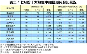以屋苑層面分析,十大熱門中細價屋苑交投量表現參差;當中共有3個屋苑包括嘉湖山莊、愉景灣及淘大花園錄得介乎18%至38%不等的跌幅;其中以排於榜首的嘉湖山莊跌38%的幅度最大,登記量由73宗縮減至上月只有45宗,而淘大花園亦跌24%至只有13宗登記。至於屯門兆康苑則逆市錄得強勁升幅,上月共有16宗700萬元以下的買賣登記,較前月的7宗大增1.3倍(詳見表二)。
