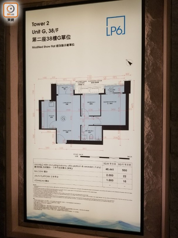 其中兩個參照第二座38樓G室搭建單位,實用面積500方呎,兩房間隔,而大廳連接22方呎露台,主人房則連接16方呎工作平台。