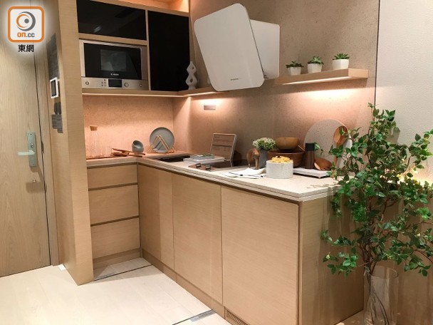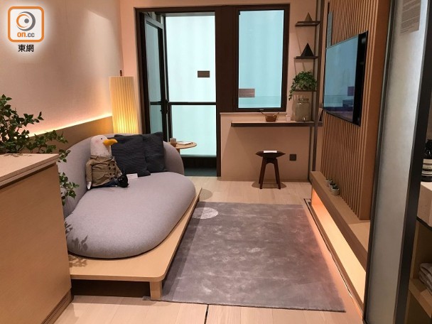 該全新一房示範單位,參照第5座38樓M室搭建,實用面積306方呎,廚房以開放式設計,大廳連接面積22方呎露台,主人房則設16方呎工作平台。
