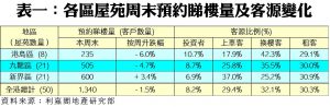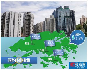 按地區劃分,全港三區指標屋苑的周末預約睇樓量兩跌一升,當中以港島區的跌幅較大,該區8個指標屋苑於周末暫錄235組客戶預約睇樓,按周下跌6.0%。利嘉閣地產太古城恆山閣(A組)高級經理黃凱達表示,受將軍澳新盤「LP6」首批開售影響,本周末準買家及代理人手均流向一手市場,太古城二手氣氛較為受壓,預約睇樓量亦有減少。黃凱達續指,目前屋苑放盤業主普遍提供約2%至3%議價空間,惟準買家則希望有5%至10%的減幅,雙方處於拉鋸局面,太古城本月暫僅錄1宗成交。