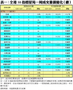 至於,九龍區21個指標屋苑上周共錄得11宗交投,按周增加38%或3宗,其中海逸豪園錄得2宗買賣,按周增加1倍;港灣豪庭亦錄得2宗成交,突破前周「食蛋」的局面;其餘黃埔花園、海濱南岸、麗港城、新都城、將軍澳中心、維景灣畔及美孚新村則各自錄得1宗成交。另外,在全港50個指標屋苑當中,上周共有34個屋苑錄得「零成交」,較前周的30個再增加13%,當中港島區佔8個,而九龍及新界區則各佔12個及14個(詳見表一)。
