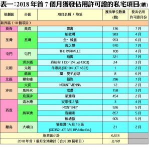 資料顯示,七月份本港共有10個私宅項目正式落成,當中包括荃灣「海之戀」,涉及970個單位;其次為筲箕灣「香島」,涉及單位伙數470個;至於其餘項目包括北角「海璇」(355伙)、屯門「珀御」(321伙)、粉嶺「囍逸」(296伙)、九龍城「喜築」(209伙)、葵涌「豐寓」(136伙)、北角「尚譽」(128伙)、筆架山龍駒道9號(45伙)及九龍城福佬村道46號(2伙) (詳見表一)。