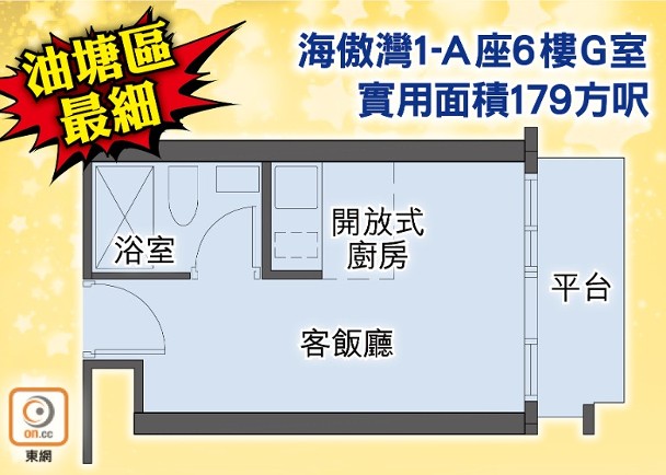 市區迷你單位仍是市場主打。九龍建業(00034)旗下油塘海傲灣,全速部署登場,樓書新近上網。其中,最細的開放式特色戶的實用面積僅由179方呎起,料為同區近年新盤最細的開則。單位為1-A座6樓G室,附設面積33方呎平台。