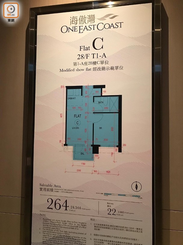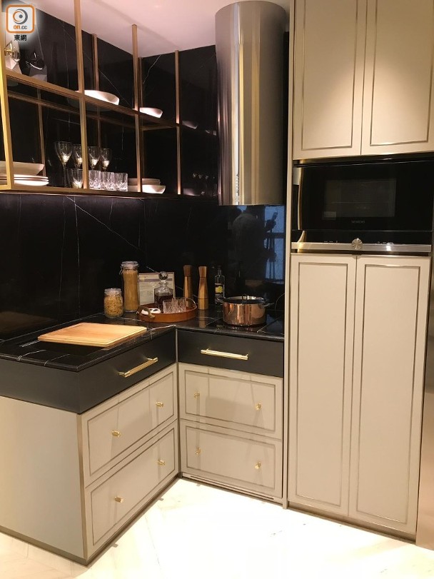 九龍建業(00034)旗下油塘海傲灣首度安排傳媒參觀示範單位,其中參照第1-A座28樓C室搭建的一房戶,實用面積264方呎,大廳連接面積22方呎露台,廚房以開放式設計。