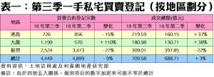 分區統計數字顯示,港島、九龍及新界區今年第三季一手私宅登記量跌多於升,其中以新界區登記量跌幅最大。數據顯示,新界區一手買賣登記由第二季的3,473宗,按季回落27%,至第三季的2,524宗,涉及金額達309.01億元,按季減少22%,跌幅相對交投量略輕。港島區亦見跌勢,季內錄得726宗一手私宅買賣登記,按季回落15%,惟登記金額卻逆市上升,由第二季的160.15億元,大增37%至219.59億元,主要受惠期內有較多高價物業成交所帶動。至於九龍區表現跑贏大市,季內一手私宅登記量由次季低基數的570宗,大增1.1倍至1,199宗,登記總值也增38%至180.98億元。