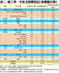 按樓盤分類,今年第三季應市新盤中,仍以新界區作主導,當中元朗峻巒發展項目共錄最多的510宗登記,涉及登記總值39.82億元,平均每宗成交價約781萬元,當中單是「PARK YOHO Milano」已佔了480宗及36.22億元。至於「匯璽II」成為最熱賣的單一新盤,共錄得495宗登記,涉及登記總值72.72億元,平均每宗成交價約1,469萬元。此外,在上季的十大熱賣新盤當中,平均每宗成交價最高者為北角「柏蔚山」,期內錄得381宗登記,平均每宗涉資2,390萬元(見表二),造就上季新盤平均售價打入歷史三甲的地位。