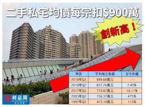值得注意的是,今年第三季平均每宗二手私宅登記涉資近900萬元(899.68萬元),創下96年有紀錄以來的歷史季度新高,與次季比較按季升7.45%;至於與特首林鄭月娥去年第三季上任同季比較,則升16.11%,並較97年高峰第三季的423.10萬元升1.13倍;若與03年次季(SARS時期)的歷史低位每宗156.37萬元比較,更累升達4.75倍。