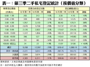 按樓價劃分,今年第三季在9個樓價組別當中,除了1億元或以上組別錄得2宗的輕微升幅外,其他8個組別全線回落,跌幅介乎15%至37%不等。當中以價值300萬至500萬元以內組別的登記量跌幅最大,首季僅錄1,957宗登記,按季大減37%。至於買賣登記量最多的500萬至700萬元以內組別,期內有2,676宗登記,惟按季亦跌29%。