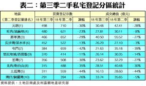按地區分析,從買賣交投量最活躍的十個地區觀察,今年第三季十區全線按季錄得跌幅;當中以土瓜灣區二手私宅登記量跌幅最急劇,季內僅錄311宗登記,較對上一季大減44%;而屯門區登記量亦錄得42%的跌幅,只得384宗。至於登記量最活躍者為元朗區,季內共錄498宗買賣登記,惟按季亦挫30%。