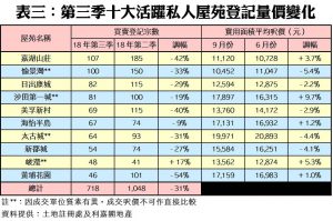 按屋苑分析,今年第三季十大活躍成交屋苑買賣登記幾近全線向下,合共只錄得718宗登記,較次季的1,048宗大跌31%。季內登記量跌幅最大的屋苑為黃埔花園,由次季的101宗登記急挫54%,至只有46宗。至於嘉湖山莊則以107宗登記蟬聯最熱賣屋苑榜首之位,但按季比較亦大跌42%,成為登記量第二大跌幅的屋苑。