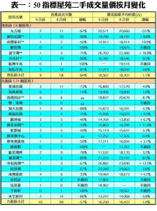 列入觀察名單的50個指標屋苑當中,上月樓價報跌的屋苑持續多於報升的屋苑,跌者共有25個,佔整體比率達一半,升者只有17個,另8個則因九月或八月份未有成交,故未能對比。上月樓價實質跌幅較顯著的屋苑包括荃灣中心、沙田第一城、美孚新村及元朗YOHO Town,分別錄6.5%、6.1%、5.8%及5.6%的實質跌幅。至於樓價逆市升幅較顯著的指標屋苑則包括馬鞍山銀湖‧天峰、藍田麗港城、東涌藍天海岸及大角咀港灣豪庭,實質按月升幅分別錄6.9%、6.2%、4.3%及4.2%。
