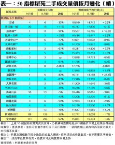 九月份50指標屋苑交投量持續急跌,全月成交僅得141宗,按月急跌52%,除連跌三個月外,更創了2005年有紀錄以來的逾十三年按月新低。在全港三區交投量之中,港島區按月跌幅最大,上月只錄得9宗交投,按月急挫84%。九龍區按月亦挫57%,共錄得43宗成交。而新界區買賣量也跌36%至只有89宗交投。