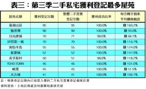 若以屋苑計算,第三季二手私宅獲利登記宗數最多的屋苑首3位依次是嘉湖山莊、愉景灣及日出康城,分別錄得95宗、90宗及70宗登記,獲利成功比率分別達100%、100%及98.6%。至於十大獲利登記宗數最多屋苑之中,亦以嘉湖山莊的每宗轉手個案平均賺幅最大,高達1.6倍(160.2%);而平均賺幅較低者則為峻瀅,只有51.5%。