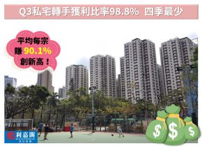 Q3私宅轉手98.8%獲利 跌至四季低位 每宗平均賺幅首破90% 創季度歷史新高