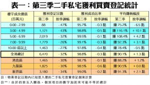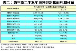 至於平均獲利幅度方面,今年第三季每宗私宅轉手個案平均賺幅為90.1%,較次季的88.8%再升1.3個百分點,已連續9個季度錄得升幅,並為季度史上新高兼首度突破九成的水平。當中,沽樓獲利1倍或以上的轉手個案佔整體二手私宅買賣比例仍然最多,達逾半的50.5%,數字較次季的48.8%,增加1.7個百分點,涉及宗數達3,309宗(詳見表二)。