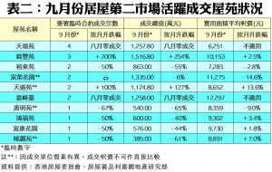 按物業價值劃分(見表一),價值500至599萬元組別交投跌幅較顯著,較八月份的17宗大減41%,至僅10宗;而期內成交總值0.54億元,按月同樣下挫41%。至於上月價值400萬元至499萬元的組別成交最多,錄得14宗買賣個案,但按月亦大跌39%,成交總值則大減40%至0.63億元。按屋苑劃分(見表二),九月份天水圍天頌苑共錄4宗買賣,涉及總值約1,257.8萬元,為上月最熱賣屋苑。