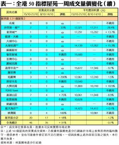 至於新界區21個指標屋苑上周共錄20宗買賣,較前周的17宗略增18%,升幅為三區之中最遜色者;其中嘉湖山莊繼續領軍,上周大錄7宗買賣,按周大升75%,成為50指標屋苑中最活躍的屋苑;其次,珀麗灣及沙田第一城則分別以3宗及2宗成交排在區內第二及第三位。另外,在全港50個指標屋苑當中,上周共有22個屋苑錄得「零成交」,較前周的30個減少逾26%,當中港島區佔3個,而九龍及新界區則各佔9個及10個(詳見表一)。