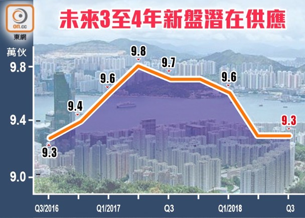 運輸及房屋局公布,截至9月底,未來3至4年一手私人住宅單位數量維持至9.3萬伙;其中已落成但仍未售出的單位數目為9,000伙,建築中的單位有8萬伙,已預售單位數目為1.4萬伙,已批出土地並可隨時動工的項目為1.8萬伙。