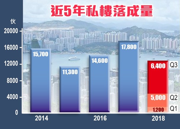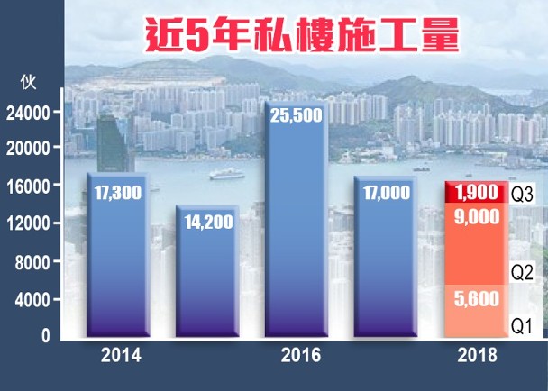 今年第3季,私人住宅施工量為1,900伙,按季下跌7,100伙,跌幅達78%;首9個月合計為1.65萬伙。已落成量為6,400伙,按季增1,400伙或28%;首9個月累計約為1.27萬伙。