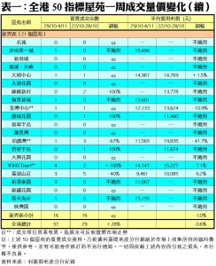 至於,新界區21個指標屋苑上周共錄16宗買賣,與前周的宗數相同,其中YOHO Town連錄4宗成交,較前周的2宗大增1倍;不過,熱門上車屋苑嘉湖山莊上周只錄得3宗買賣,較前周的5宗減少40%;珀麗灣交投亦按周減少67%,上周僅得1宗成交。另外,在全港50個指標屋苑當中,上周共有30個屋苑錄得「零成交」,較前周的32個減少6%,當中港島區佔4個,而九龍及新界區則各佔14個及12個(詳見表一)。
