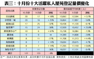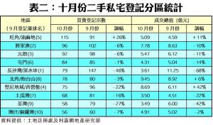 按全港三區作分析,十月份港九新界三區登記量全線下跌。當中,以新界區跌幅最大,月內僅錄824宗登記,按月挫16%。九龍區亦錄得15%的跌幅,由前月的615宗減少至上月的525宗;而港島區更加只有433宗登記,按月亦跌13%。另外,十大最活躍成交分區登記量十居其九均錄跌幅,當中以長沙灣/深水埗區的跌幅最大,由前月的147宗急降至上月的79宗,減幅達46%。至於旺角/油麻地區是唯一逆市錄得升幅的地區,按月升26%,以115宗之數成為最熱賣的分區。