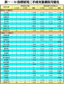 列入觀察名單的50個指標屋苑當中,上月樓價報跌的屋苑明顯多於報升的屋苑,跌者共有31個,佔整體比率達62%,升者只有10個,另9個則因十月或九月份未有成交,故未能比對。上月樓價實質跌幅較顯著的屋苑包括荃灣綠楊新村、沙田第一城、荃灣愉景新城及荃灣麗城花園,分別錄9.8%、8.6%、7.2%及7.1%的實質跌幅。至於樓價逆市升幅較顯著的指標屋苑則包括荔枝角美孚新村、藍田麗港城、將軍澳新都城及鰂魚涌太古城,實質按月升幅分別錄7.8%、5.0%、4.2%及2.7%。