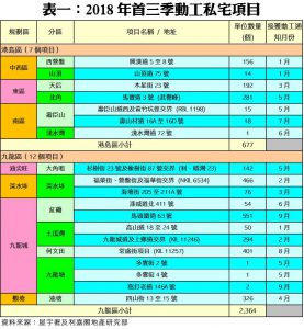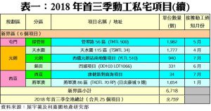 連同上述項目,2018年首三季全港共有25個私宅項目動工,涉及單位總數9,759伙。當中以新界區的施工伙數最多,涉及6個項目共6,718伙,單位佔整體比例逾68.8%;九龍區則共有12個私宅項目動工,單位數量共2,364伙,佔整體比率逾24.2%;港島區共有7個項目、合共677個單位動工,佔整體比例逾6.9%。