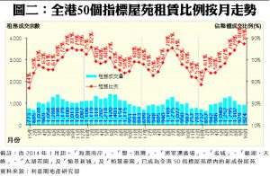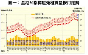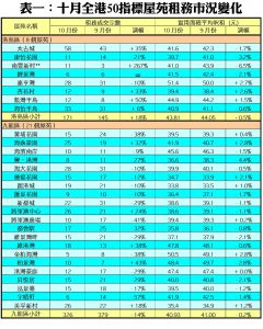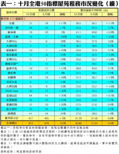 十月份50指標屋苑租賃交投錄得924宗,較九月份的929宗微減0.5%,創八個月新低。上月50指標屋苑買賣成交量略見增加,而租賃交投量則維持平穩,令上月50指標屋苑租賃佔整體成交比例稍降至84.5%,按月下跌約2個百分點,為自2005年起有紀錄以來次高。