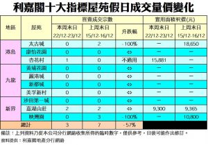 《利嘉閣十大指標屋苑假日二手實況》 濃厚節日氣氛 新盤搶焦點 二手銷情淡靜 十大屋苑周末錄3宗買賣 結束四周升勢