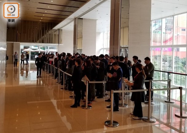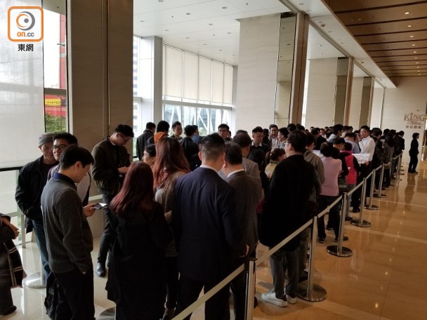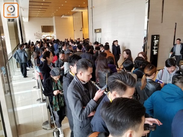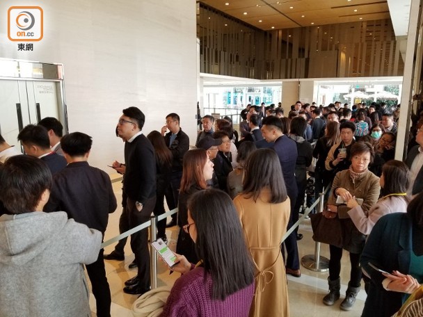 中國海外發展(00688)大埔天鑽今日(4日)開放示範單位予公眾參觀。據下午2時現場所見,售樓處樓下電梯大堂,有逾百名睇樓客及代理排隊等待參觀,出現「打蛇餅」的情況;而售樓處所在的大廈地下周邊街道,亦有不少代理撈客。