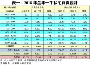 利嘉閣地產研究部主管陳海潮表示,受中美貿易戰及加息等不利因素困擾,去年下半年尤其第四季最後兩個月,一手新盤買賣急轉直下。根據利嘉閣地產研究部綜合土地註冊處數據,2018年全港共錄一手私宅買賣登記15,453宗,較2017年的18,503宗下跌約16%,為連升兩年後首度回落,並創下近5年來的低位,當中1億元或以上的登記有126宗,按年逆市大增42%。
