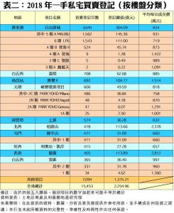 按樓盤分類,2018年熱賣樓盤之首為將軍澳日出康城5期A的「MALIBU」,項目全年合共錄得1,562宗買賣登記,佔整體15,453宗登記中的10%,成交總額則達145.36億元;而同區6期項目「LP6」及白石角「嘉熙」,分別以1,543宗及708宗登記,分列第二及第三位,而兩個項目成交總額分別達111.00億元及62.28億元(見表二)。