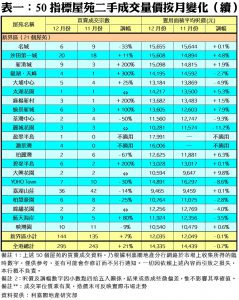 列入觀察名單的50個指標屋苑當中,上月樓價報跌的屋苑仍然較多,跌者共有25個,佔整體比率一半,升者則增加至17個,另8個則因十二月或十一月份未有成交而未能比較。上月樓價實質跌幅較顯著的屋苑包括荃灣麗城花園、荃灣中心、元朗 YOHO Town及長沙灣宇晴軒,分別錄11.2%、9.3%、8.6%及7.9%的實質跌幅。至於逆市錄得樓價升幅較顯著的指標屋苑包括屯門大興花園、紅磡海逸豪園、荃灣愉景新城及馬灣珀麗灣,實質按月升幅分別錄9.8%、8.9%、7.9%及6.3%。