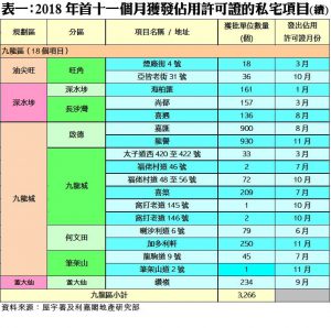 資料顯示,去年十一月份本港共有4個私宅項目正式落成,當中較具規模項目為荃灣「海之戀‧愛炫美」,涉及1,436個單位;其次為啟德「龍譽」,涉及單位伙數930個;至於其他項目包括何文田「加多利軒」(250伙)及筆架山道2號(1伙) (詳見表一)。