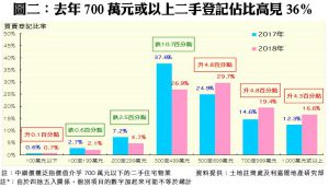 回顧2018年,樓價介乎100萬至500萬元以內的3個組別之中細價二手住宅買賣佔比全告回落,當中又以登記佔比最多的300萬500萬元以內組別之跌幅最大,去年僅佔26.9%,較2017年的37.6%大跌10.7個百分點,成跌幅最大的組別(見圖二)。反之700萬元以上的兩個中高價組別則雙雙錄得升幅,共計佔比36.0%,按年大升9.1個百分點,創下歷史新高。