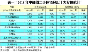 若以十大活躍成交地區作分析,去年十個地區的中細價二手住宅買賣登記量十居其九均下跌,其中只有旺角/油麻地錄得9%升幅,至1,840宗。至於錄得跌幅的九區之中,將軍澳跌幅最顯著,由2017年的1,570宗,急跌38%,至去年的973宗。其次荃灣區亦減少29%,去年共錄1,105宗成交;至於榜首常客的屯門區亦跌10%,由前年的2,632宗登記減至去年的2,370宗(見表一)。