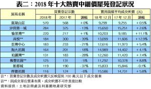 以屋苑層面分析,十大熱門中細價屋苑交投雖以跌者為主,惟排在三甲的屋苑有兩個出現微升,分別是錄得最多570宗登記的嘉湖山莊,較2017年的568宗微增2宗;而排第三位的愉景灣亦升1%,至220宗。至於錄得跌幅的屋苑共有8個,當中以尚悅的跌幅最大,由2017年的300宗,急挫39%,至去年的184宗;其他錄得較大跌幅的屋苑還包括新都城及珀麗灣,各自按年跌37%及28%。