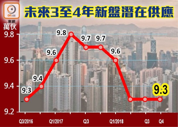 運輸及房屋局公布,截至2018年12月底,未來3至4年一手私人住宅單位數量續維持至9.3萬伙;其中已落成但仍未售出的單位數目為9,000伙,建築中的單位有7.4萬伙,已預售單位數目為1萬伙,已批出土地並可隨時動工的項目為2萬伙。