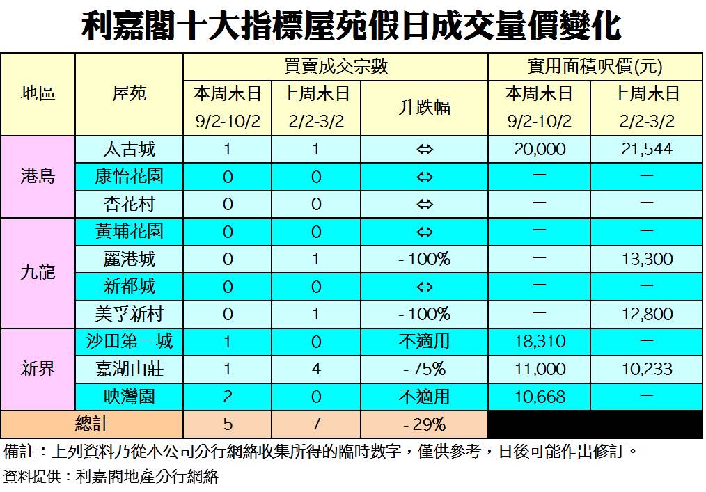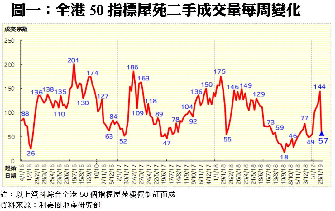 《利嘉閣十大指標屋苑假日二手實況》 農曆新年後首周末 買家業主未回歸 十大屋苑周末錄5宗買賣 按周下滑29% 研究報告 2019-02-11 by Chan Derek · Published 2019-02-11
