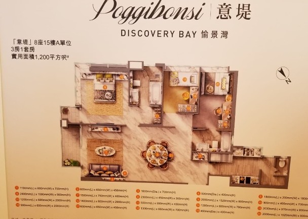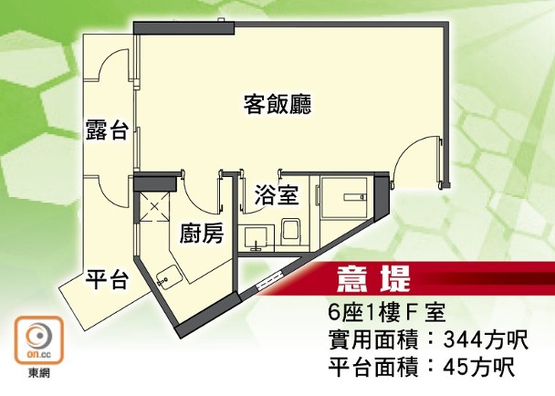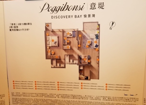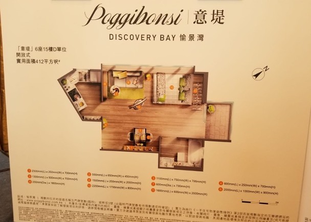 發展商展示項目3類戶型的平面圖,涉及開放式、兩房及三房戶,其中6座15樓D室,實用面積412方呎,開放式設計,設獨立廚房,享有山海景,為項目自1988年後,事隔逾30年再有同類供應。資料顯示,意堤面積由344方呎起,面積細絕愉景灣項目。
