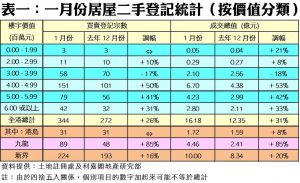 按樓價作分析(見表一),6個價格分類交投量有4個報升,升幅介乎10%至50%不等,當中以價值400至499萬元的成交增幅最大,由去年十二月的101宗增加至上月151宗,升幅約50%。如以地區劃分,九龍及新界區二手居屋登記分別按月上升85%及16%,至89宗及224宗登記,而港島區期內只有31宗,按月持平。