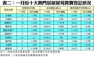如按屋苑細分(見表二),天水圍天頒苑按月分別減14%至12宗登記,而屋苑期內成交總值4,425.0萬元,按月減少10%,但仍是上月最熱賣屋苑首位。而次席則為天水圍天富苑,屋苑成交11宗,按月大減31%;成交總值4,401.5萬元,較去年十二月份下跌29%。
