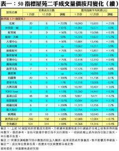 列入觀察名單的50個指標屋苑當中,上月樓價報升的屋苑較多,共有29個,佔整體比率達58%,跌者則減少至18個,另3個則因十二月或一月份沒有成交而未能比較。上月樓價實質升幅較顯著的屋苑包括荃灣麗城花園、東涌藍天海岸、元朗YOHO Town及柴灣杏花村,分別錄7.2%、7.0%、6.3%及5.8%的實質升幅。至於逆市錄得樓價跌幅較顯著的指標屋苑包括青衣灝景灣、將軍澳都會駅、奧運站帝柏海灣及紅磡黃埔花園,實質按月跌幅分別為9.8%、8.8%、7.4%及7.4%。