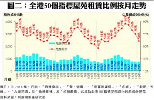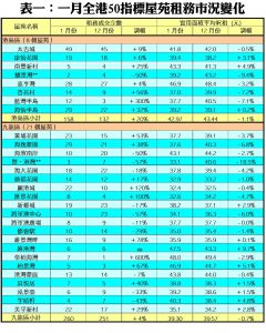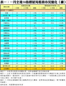 陳海潮指出,租金尾隨樓價已相應連跌五個月,而一月份樓價已率先止跌微升,相信租金跌幅亦可望進一步收窄。相比去年十一月份及十二月份分別錄得的1.5%及1.2%之跌幅,今年一月份的0.7%跌幅已見縮窄。目前樓市氣氛明顯好轉,入市信心增強,相信樓價進一步回升亦可帶動租金向好,料二月份租金跌幅將持續收窄至約0.3%,預期50指標屋苑整體平均呎租在35.4元左右暫見支持。