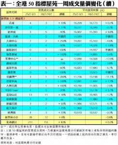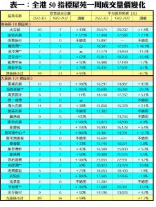 至於,新界區21個指標屋苑上周累錄78宗買賣,按周增加8%,其中大埔中心及珀麗灣分別錄得7宗及3宗成交,按周增幅各達2.5倍及2倍;愉景新城、碧堤半島及大興花園分別有2宗、4宗及2宗買賣,各自按周增加1倍;熱門上車屋苑沙田第一城及嘉湖山莊上周各有12宗及13宗買賣,按周增幅分別達71%及18%。另外,在全港50個指標屋苑當中,上周只有4個屋苑錄得「零成交」,較前周的6個再減少33%,當中九龍及新界區各佔2個,港島區屋苑則全線均錄得成交(詳見表一)。