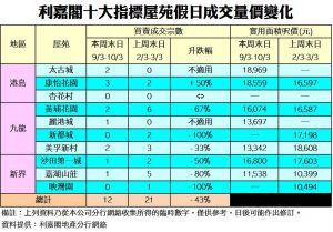 《利嘉閣十大指標屋苑假日二手實況》 一手新盤搶焦點 二手業主反價盤源減少 十大屋苑周末錄12宗買賣 按周減少9宗