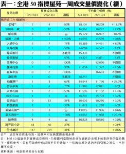 至於,港島區8個指標屋苑上周累錄31宗成交,按周減少30%,其中南豐新村及海怡半島分別錄得4宗買賣,各自較前周的7宗減少43%;康怡花園及藍灣半島則各錄6宗及2宗成交,按周分別減少33%;藍籌屋苑太古城則錄得9宗買賣,較前周的10宗輕微回落10%。另外,在全港50個指標屋苑當中,上周共有6個屋苑錄得「零成交」,較前周的3個增加1倍,當中港島、九龍及新界區各佔2個(詳見表一)。