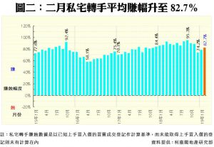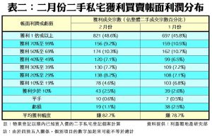 數據顯示,今年二月份每宗私宅轉手個案平均賺幅為82.7%,由去年十二月的74.2%(當時的20個月新低),連升2個月,重返八成以上的水平(見圖二)。二月份,帳面獲利1倍或以上的轉手個案佔整體二手私宅買賣比例回升至接近一半,達48.6%,按月升2.8個百分點,共錄得821宗;至於帳面錄得虧損者則減少至19宗,佔比按月回落至1.1%,並按月減少1.4個百分點,可見蝕讓沽貨情況續見改善。