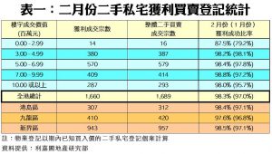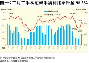 市況回暖 私宅轉手獲利比率彈升至98.3% 二月份平均每宗賺幅82.7% 連升兩月